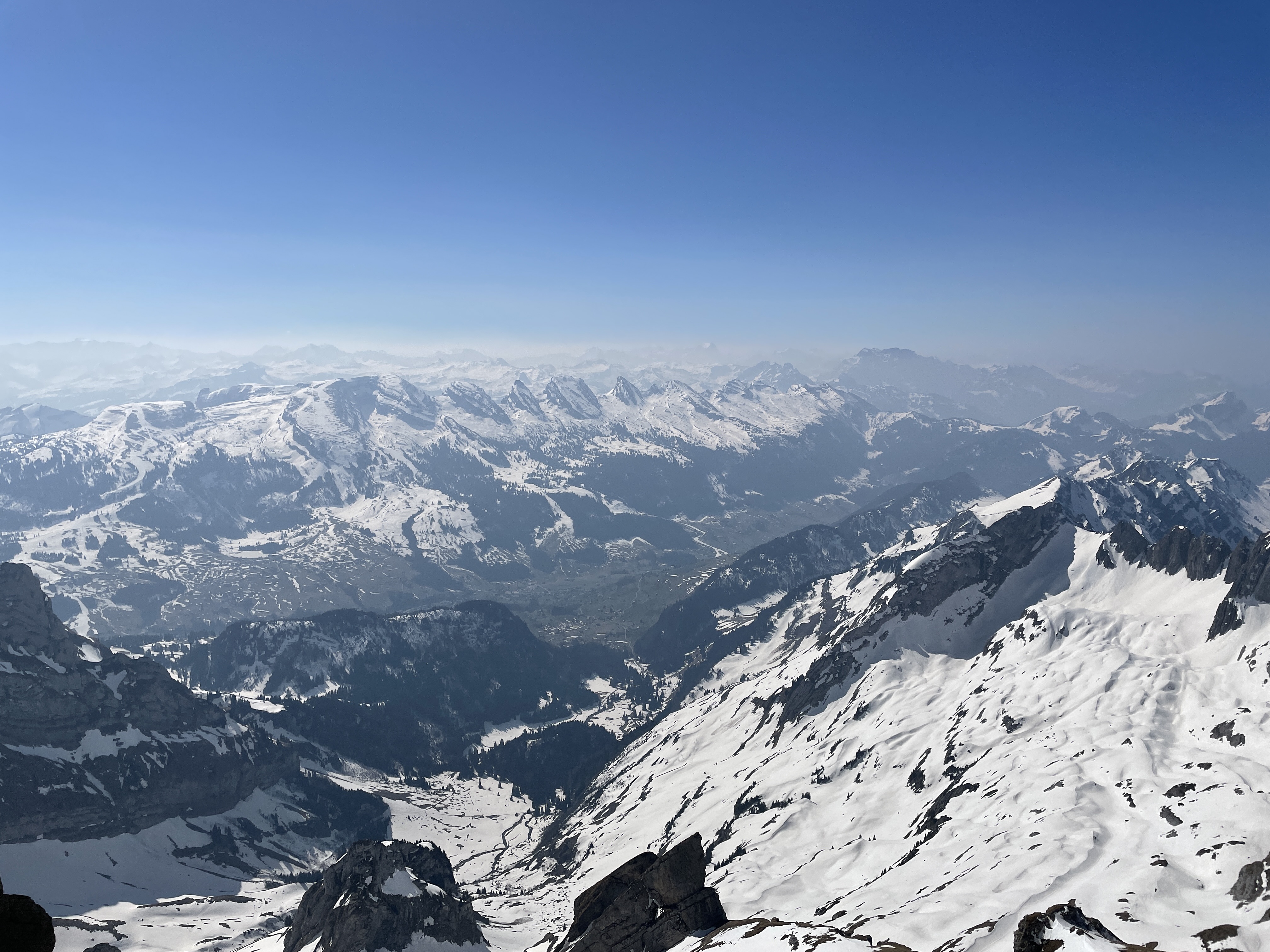이때가 아직 3월 말이라, 눈이 아직도 많이 쌓여 있어서 아름다운 설경은 볼 수 있었다. 다만, 약간 산 정상부가 약간 흐릿해서 6개국을 찾기는 어려웠다. 가끔가다 스위스인이나 스위스에 오래 산 산덕후(?)들은 봉우리 모양만 보고도 이름을 맞추거나 저기가 독일이다 라는둥 지명을 쏟아내던데. 우리는 산 정상에서 가져온 간식을 나눠먹은 뒤 내려와 호텔의 카페에서 핫초콜렛을 마신 뒤 아펜첼 칸톤의 아펜첼 타운으로 향했다.