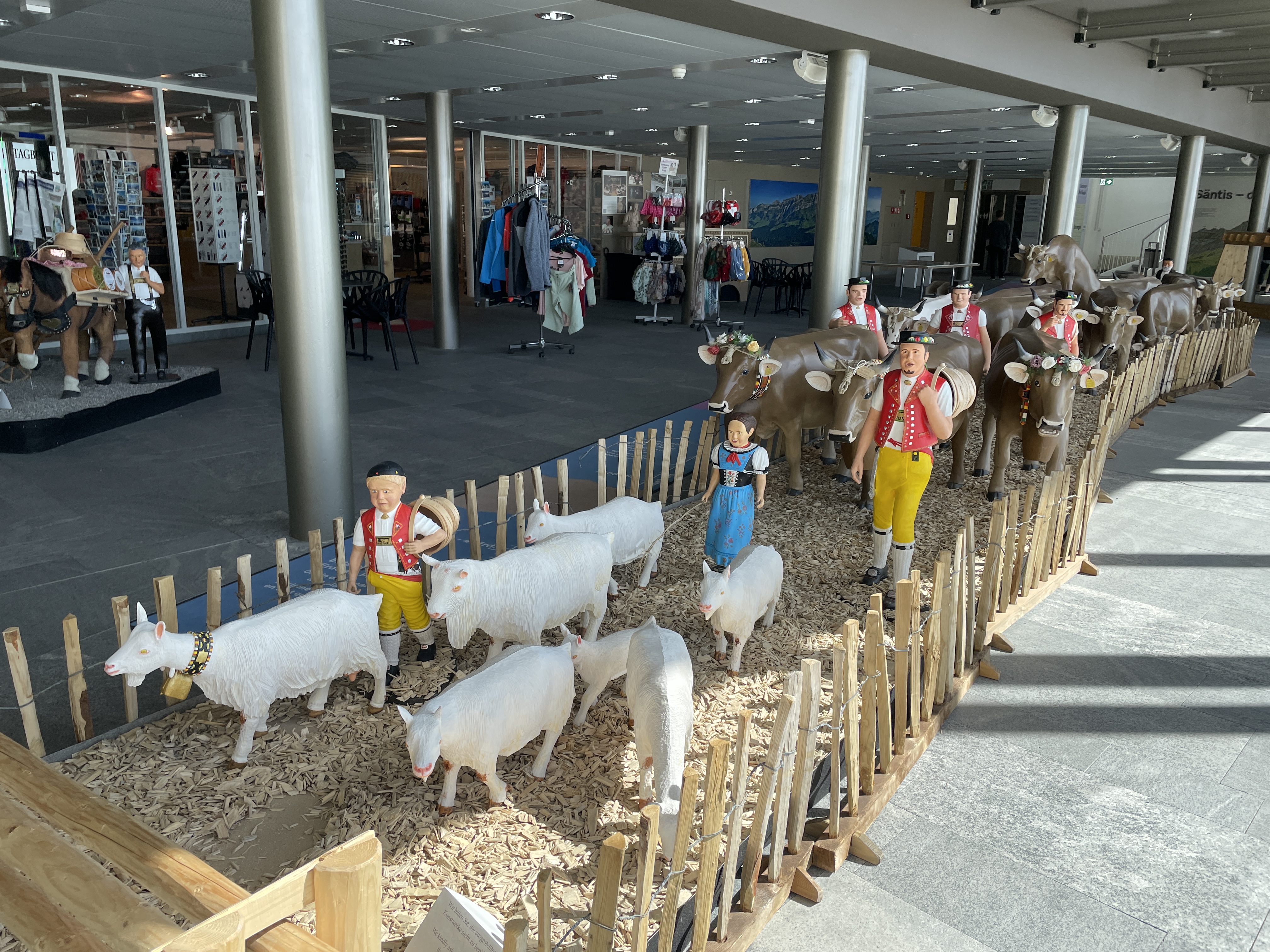 케이블카에서 내려 전망대 건물에 도착하니 아펜첼을 대표하는 이미지가 인형으로 장식되어있었다. 목에 종을 단 염소와 소, 그리고 알록달록 전통의상을 입고 전통모자를 쓴 어른과 아이들이 친근했다.