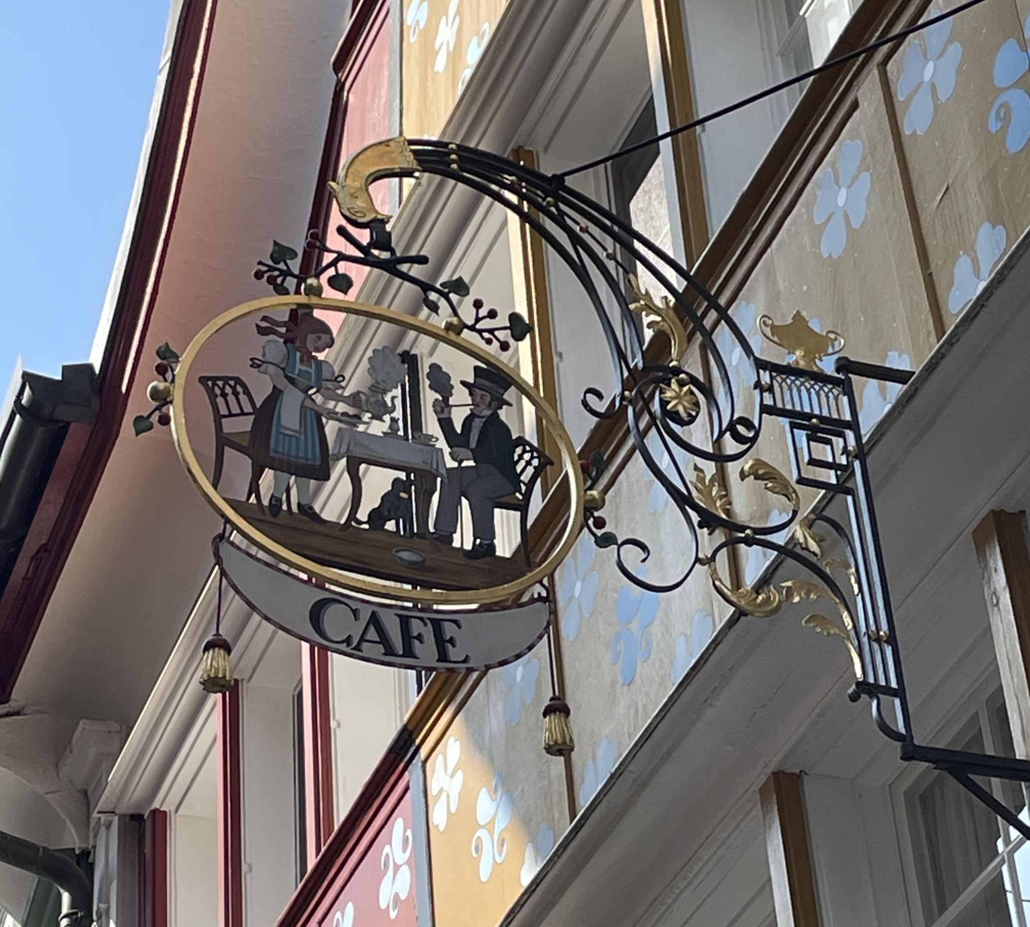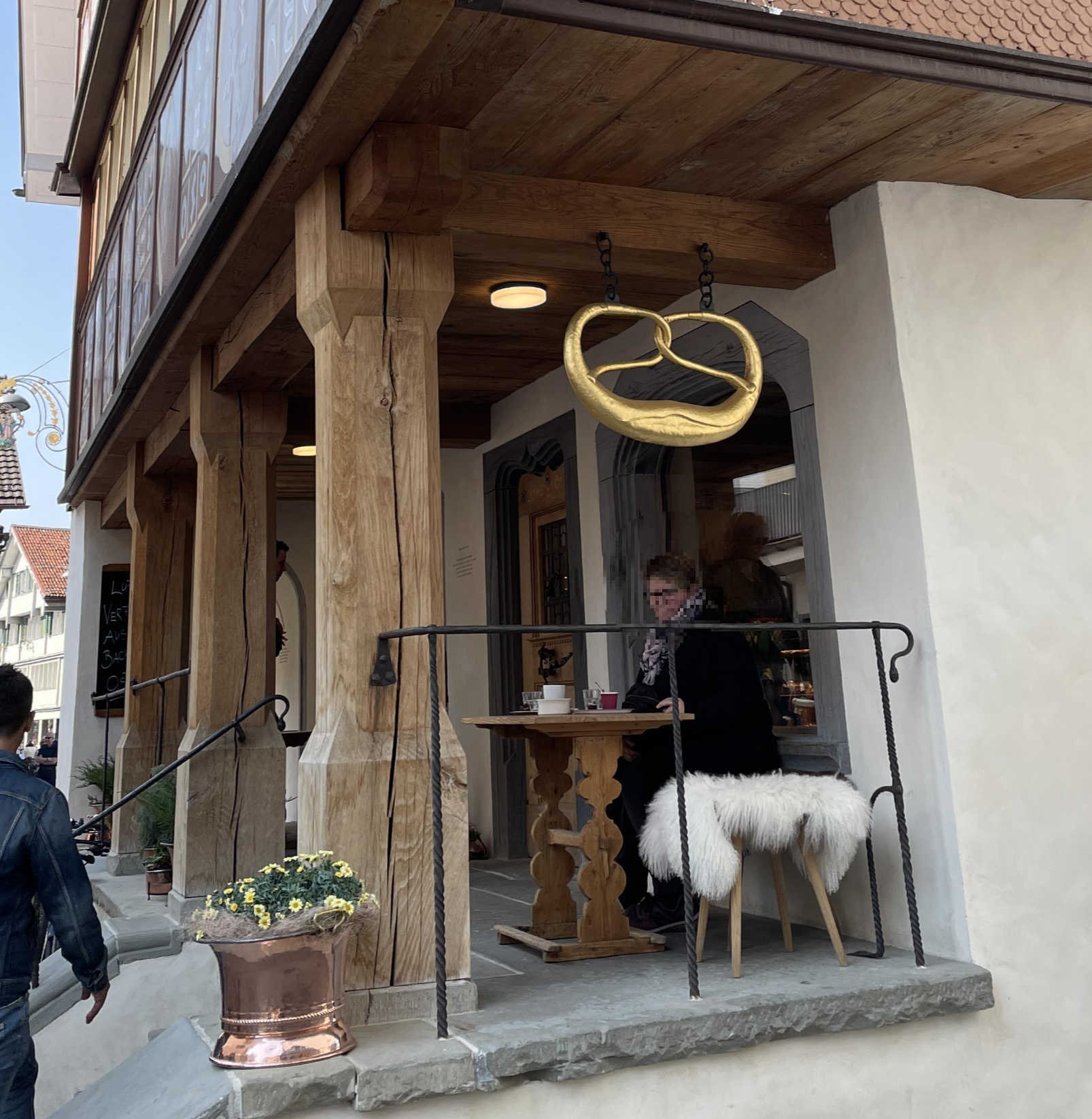 아펜첼 시내의 귀여운 구석은 바로 외벽 장식 패턴과 이 벽 간판들. 아래 두 간판들은 티 가게와 빵가게였다. 가게의 캐릭터를 살리면서도 유니크한게, 꼭 주문제작같다. 높게 달려있는데도, 낡거나 칠 벗겨진 구석 하나 없이 반질반질 윤이 난다. 스위스답다.