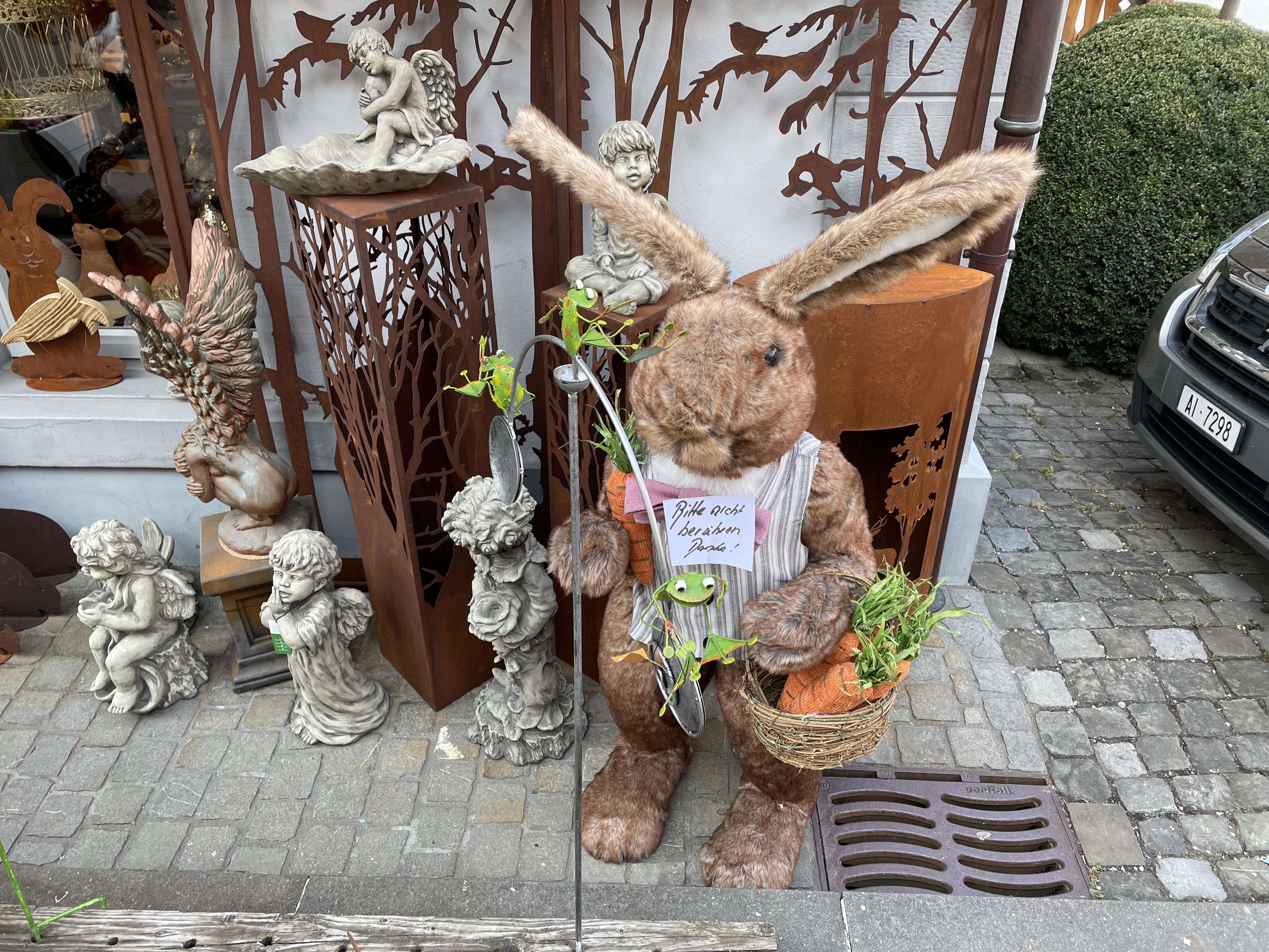 근사한 점심을 마무리하고 우리는 동네 산책에 나섰다. 이날이 이스터 즈음이어서 동네는 이스터 장식으로 여기저기 꾸며져 있었다. 우리나라에서 토끼 하면 귀엽고 사랑스러운 느낌이었는데, 스위스 토끼는 왠지 좀 무서웠다. 나중에 독일에서도 이스터 토끼를 봤는데 거기도 비슷했다. 귀여워야 잘팔리지 않을까... 아님 귀여움의 기준이 좀 다른가? 아니면 토끼이기만 하면 아무래도 상관없나? 스위스/독일이면 그럴지도.