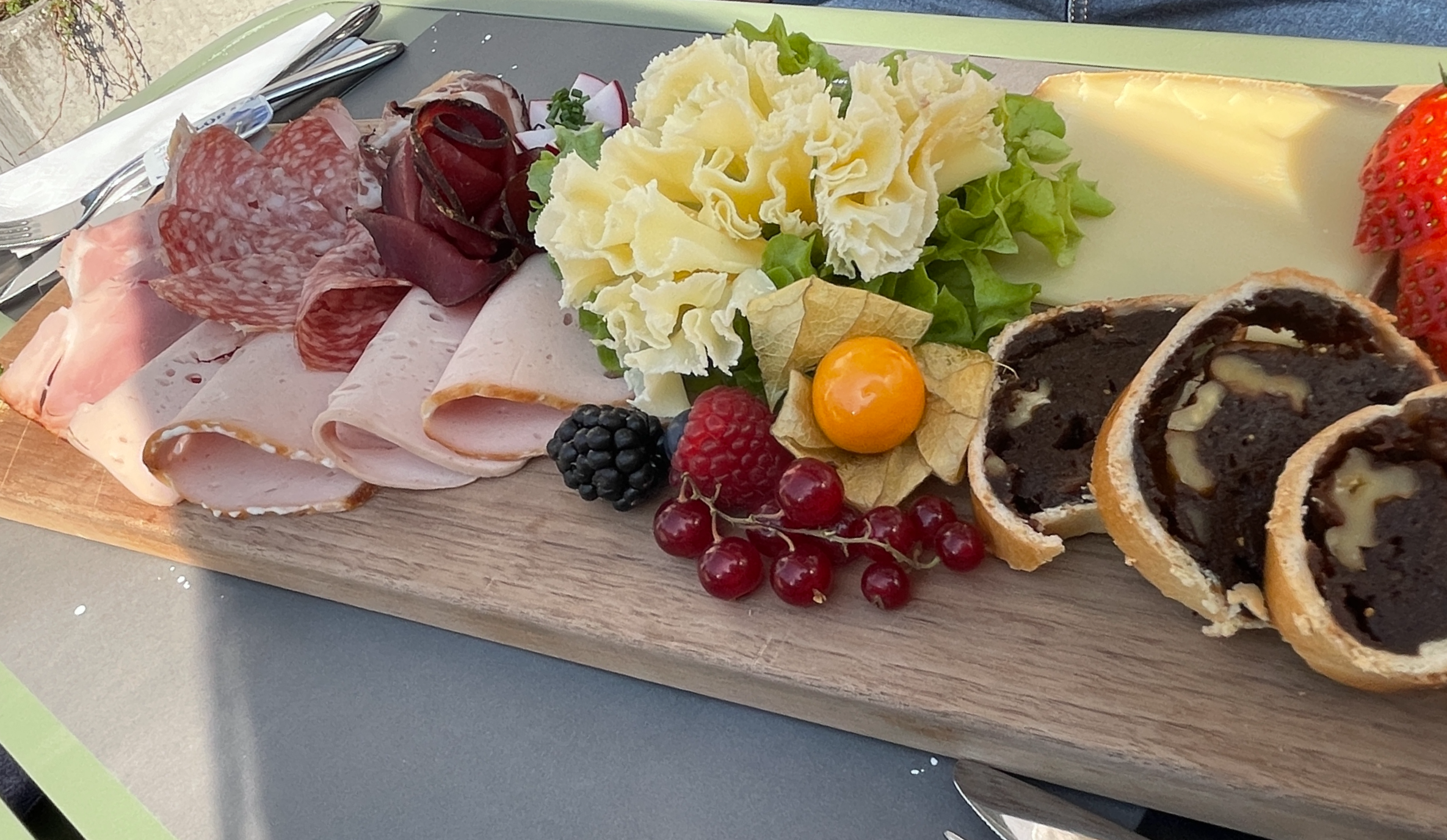 이건 친구가 주문한 플래터. 이런 플래터를 지칭하는 스위스독일어식 이름을 들었는데 잊었다. 양배추 꽃처럼 생긴 저것은 얇게 긁어낸(?) 치즈다. 나중에 마트에서 저 치즈를 똑같이 파는걸 봤다.