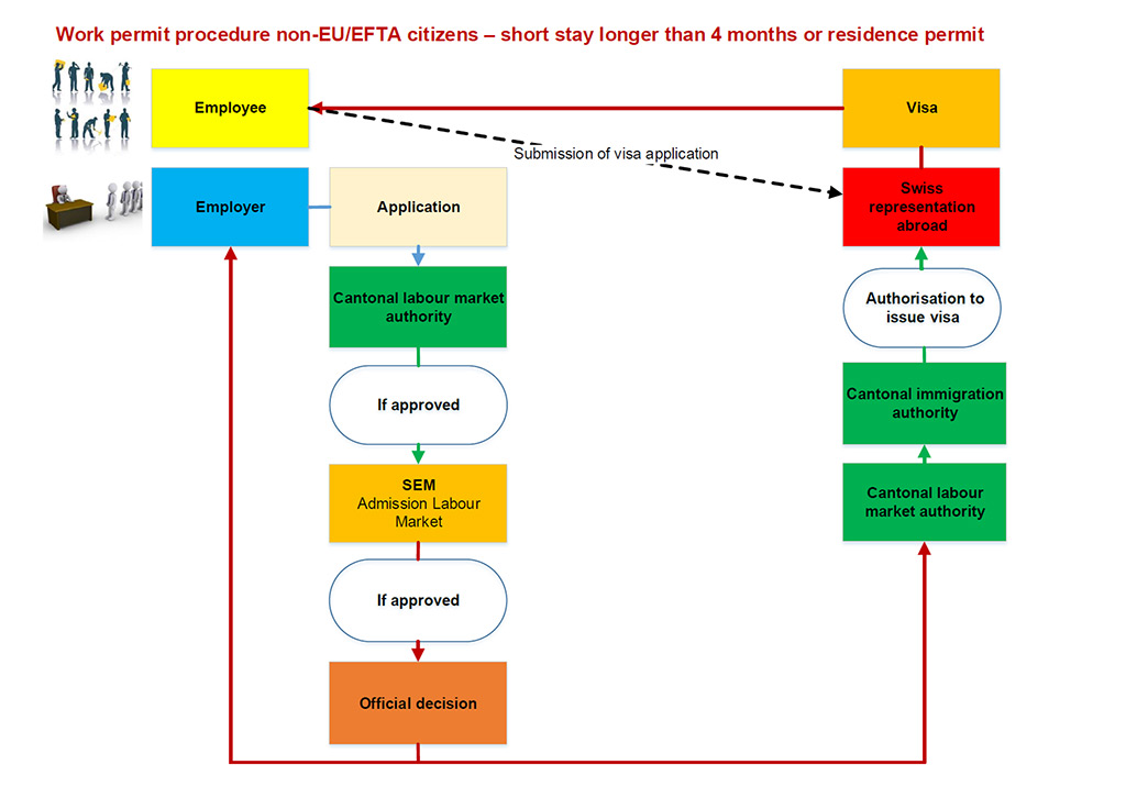 Stay of more than 4 months Stay of less than 4 months Application submission The employer submits the application documents to the cantonal employment or immigration authority. Employees requiring a visa must also submit an application to the Swiss represe